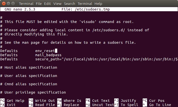 A file opens directly in the Terminal window using the Nano text editor. Use the arrow keys on your keyboard to move the cursor to the end of Defaults env_reset see in below given image,